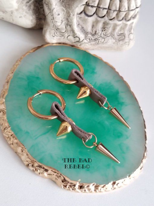 Original creoles Placage Or 14KT Homme !! DOUBLE SPIKE !! Jaune en Cuir et Acier Inoxydable Long T.5.5cm x 1.8cm The Bad Rebel collection LEATHER SPIKE!!